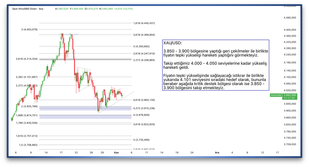 3.850 - 3.900 bölgesine yaptığı geri çekilmeler ile birlikte fiyatın tepki yükselişi hareketi yaptığını görmekteyiz. Takip ettiğimiz 4.000 - 4.050 seviyelerine kadar yükseliş hareketi geldi. Fiyatın tepki yükselişinde sağlayacağı istikrar ile birlikte yukarıda 4.101 seviyesini sıradaki hedef olarak, bununla beraber aşağıda kritik destek bölgesi olarak ise 3.850 - 3.900 bölgesini takip etmekteyiz.