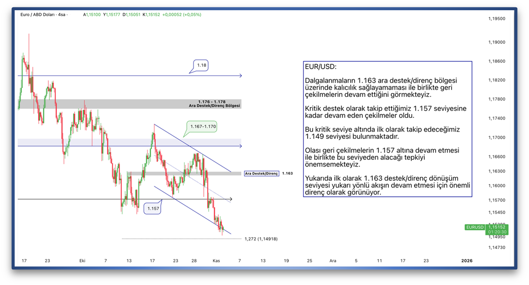 Dalgalanmaların 1.163 ara destek/direnç bölgesi üzerinde kalıcılık sağlayamaması ile birlikte geri çekilmelerin devam ettiğini görmekteyiz. Kritik destek olarak takip ettiğimiz 1.157 seviyesine kadar devam eden çekilmeler oldu. Bu kritik seviye altında ilk olarak takip edeceğimiz 1.149 seviyesi bulunmaktadır. Olası geri çekilmelerin 1.157 altına devam etmesi ile birlikte bu seviyeden alacağı tepkiyi önemsemekteyiz. Yukarıda ilk olarak 1.163 destek/direnç dönüşüm seviyesi yukarı yönlü akışın devam etmesi için önemli direnç olarak görünüyor.