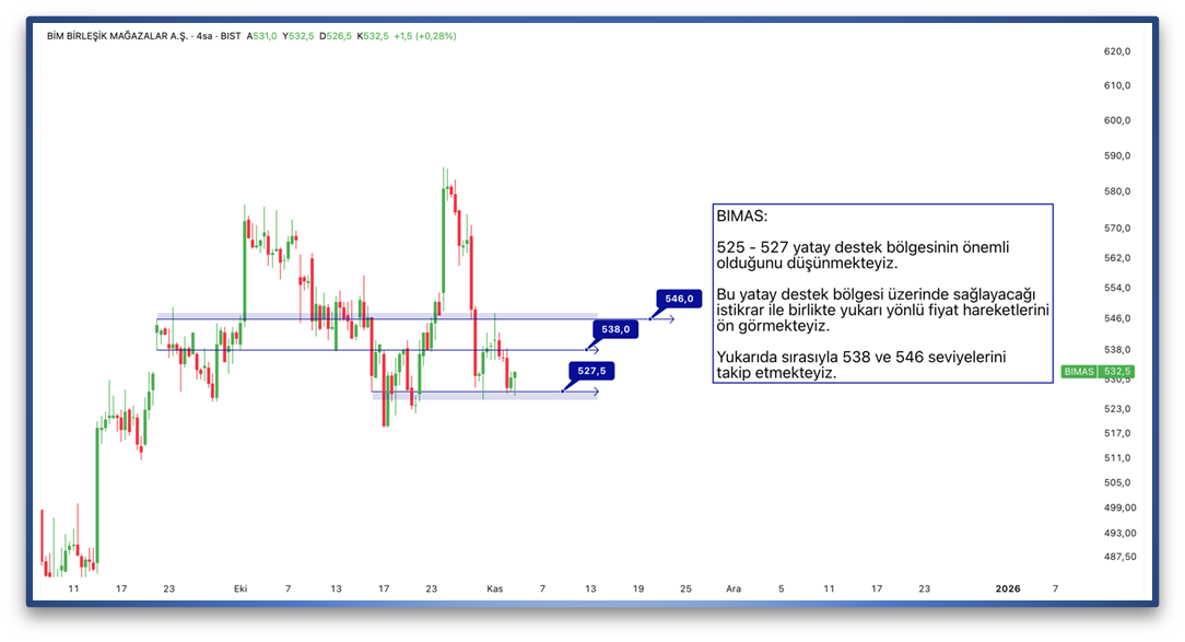 525 - 527 yatay destek bölgesinin önemli olduğunu düşünmekteyiz. Bu yatay destek bölgesi üzerinde sağlayacağı istikrar ile birlikte yukarı yönlü fiyat hareketlerini ön görmekteyiz. Yukarıda sırasıyla 538 ve 546 seviyelerini takip etmekteyiz.