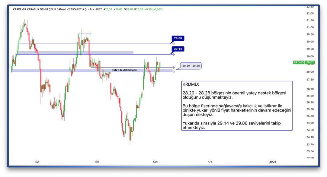 28.20 - 28.28 bölgesinin önemli yatay destek bölgesi olduğunu düşünmekteyiz. Bu bölge üzerinde sağlayacağı kalıcılık ve istikrar ile birlikte yukarı yönlü fiyat hareketlerinin devam edeceğini düşünmekteyiz. Yukarıda sırasıyla 29.14 ve 29.86 seviyelerini takip etmekteyiz.