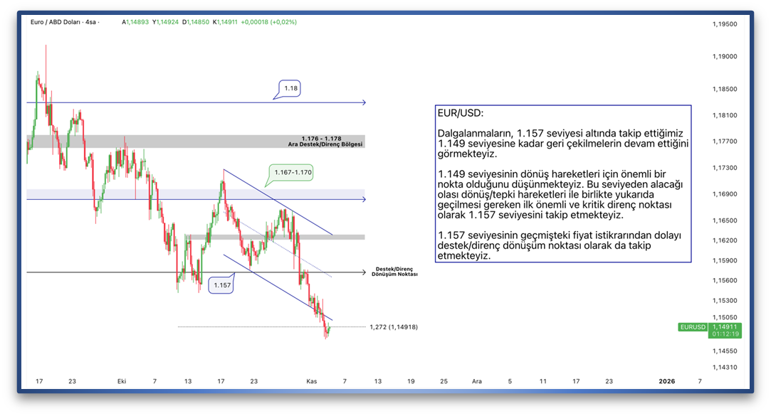 Dalgalanmaların, 1.157 seviyesi altında takip ettiğimiz 1.149 seviyesine kadar geri çekilmelerin devam ettiğini görmekteyiz. 1.149 seviyesinin dönüş hareketleri için önemli bir nokta olduğunu düşünmekteyiz. Bu seviyeden alacağı olası dönüş/tepki hareketleri ile birlikte yukarıda geçilmesi gereken ilk önemli ve kritik direnç noktası olarak 1.157 seviyesini takip etmekteyiz. 1.157 seviyesinin geçmişteki fiyat istikrarından dolayı destek/direnç dönüşüm noktası olarak da takip etmekteyiz.