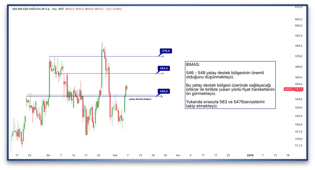 546 - 548 yatay destek bölgesinin önemli olduğunu düşünmekteyiz. Bu yatay destek bölgesi üzerinde sağlayacağı istikrar ile birlikte yukarı yönlü fiyat hareketlerini ön görmekteyiz. Yukarıda sırasıyla 563 ve 5476seviyelerini takip etmekteyiz.