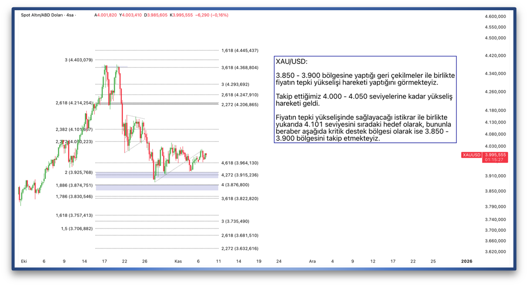 3.850 - 3.900 bölgesine yaptığı geri çekilmeler ile birlikte fiyatın tepki yükselişi hareketi yaptığını görmekteyiz. Takip ettiğimiz 4.000 - 4.050 seviyelerine kadar yükseliş hareketi geldi. Fiyatın tepki yükselişinde sağlayacağı istikrar ile birlikte yukarıda 4.101 seviyesini sıradaki hedef olarak, bununla beraber aşağıda kritik destek bölgesi olarak ise 3.850 - 3.900 bölgesini takip etmekteyiz.