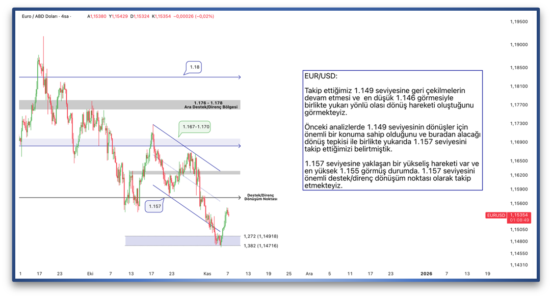 Takip ettiğimiz 1.149 seviyesine geri çekilmelerin devam etmesi ve en düşük 1.146 görmesiyle birlikte yukarı yönlü olası dönüş hareketi oluştuğunu görmekteyiz. Önceki analizlerde 1.149 seviyesinin dönüşler için önemli bir konuma sahip olduğunu ve buradan alacağı dönüş tepkisi ile birlikte yukarıda 1.157 seviyesini takip ettiğimizi belirtmiştik. 1.157 seviyesine yaklaşan bir yükseliş hareketi var ve en yüksek 1.155 görmüş durumda. 1.157 seviyesini önemli destek/direnç dönüşüm noktası olarak takip etmekteyiz.