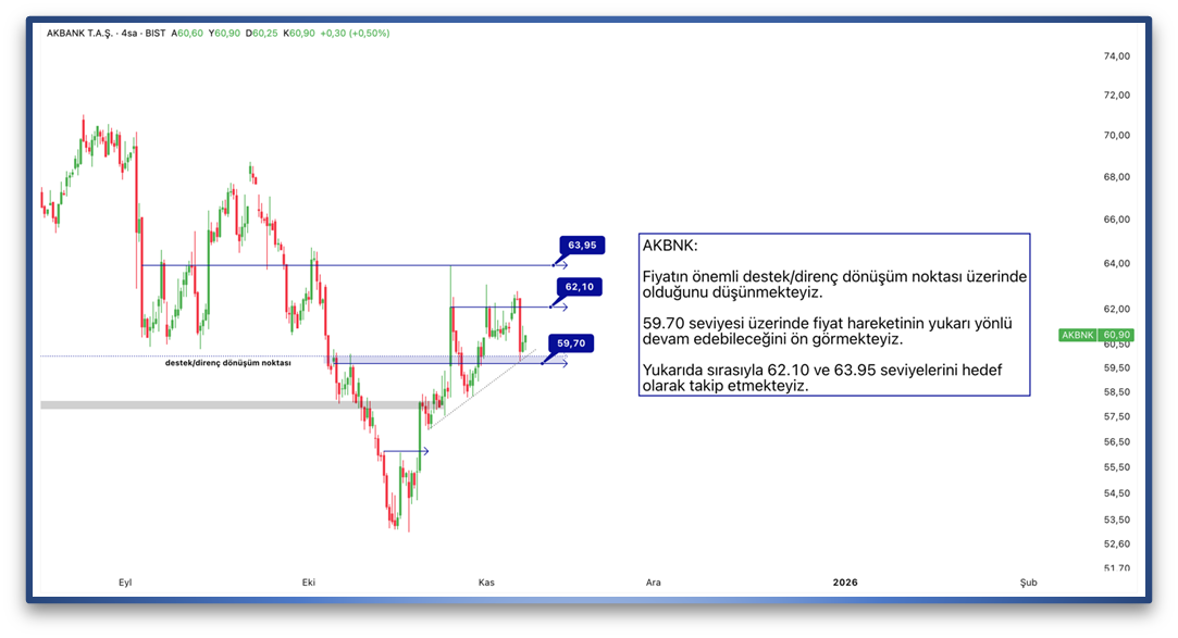 Fiyatın önemli destek/direnç dönüşüm noktası üzerinde olduğunu düşünmekteyiz. 59.70 seviyesi üzerinde fiyat hareketinin yukarı yönlü devam edebileceğini ön görmekteyiz. Yukarıda sırasıyla 62.10 ve 63.95 seviyelerini hedef olarak takip etmekteyiz.
