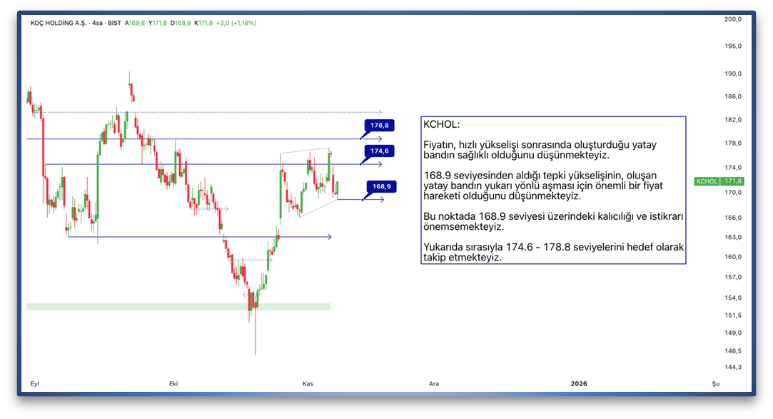 Fiyatın, hızlı yükselişi sonrasında oluşturduğu yatay bandın sağlıklı olduğunu düşünmekteyiz. 168.9 seviyesinden aldığı tepki yükselişinin, oluşan yatay bandın yukarı yönlü aşması için önemli bir fiyat hareketi olduğunu düşünmekteyiz. Bu noktada 168.9 seviyesi üzerindeki kalıcılığı ve istikrarı önemsemekteyiz. Yukarıda sırasıyla 174.6 - 178.8 seviyelerini hedef olarak takip etmekteyiz.