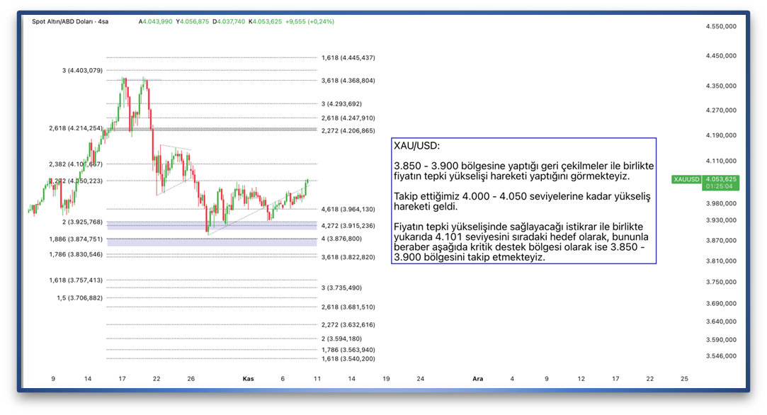 3.850 - 3.900 bölgesine yaptığı geri çekilmeler ile birlikte fiyatın tepki yükselişi hareketi yaptığını görmekteyiz. Takip ettiğimiz 4.000 - 4.050 seviyelerine kadar yükseliş hareketi geldi. Fiyatın tepki yükselişinde sağlayacağı istikrar ile birlikte yukarıda 4.101 seviyesini sıradaki hedef olarak, bununla beraber aşağıda kritik destek bölgesi olarak ise 3.850 - 3.900 bölgesini takip etmekteyiz.