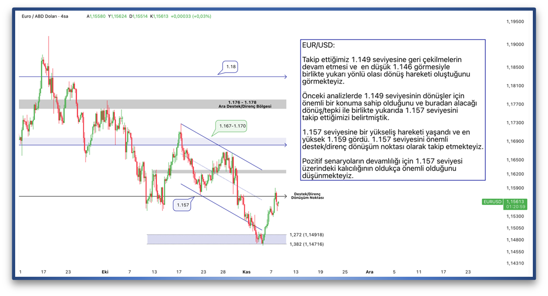 Takip ettiğimiz 1.149 seviyesine geri çekilmelerin devam etmesi ve en düşük 1.146 görmesiyle birlikte yukarı yönlü olası dönüş hareketi oluştuğunu görmekteyiz. Önceki analizlerde 1.149 seviyesinin dönüşler için önemli bir konuma sahip olduğunu ve buradan alacağı dönüş/tepki ile birlikte yukarıda 1.157 seviyesini takip ettiğimizi belirtmiştik. 1.157 seviyesine bir yükseliş hareketi yaşandı ve en yüksek 1.159 gördü. 1.157 seviyesini önemli destek/direnç dönüşüm noktası olarak takip etmekteyiz. Pozitif senaryoların devamlılığı için 1.157 seviyesi üzerindeki kalıcılığının oldukça önemli olduğunu düşünmekteyiz.