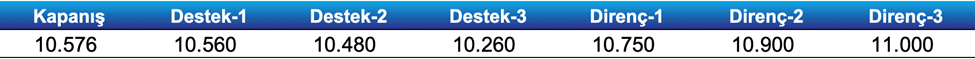 - Endeks, kısa vadeli yönde izlediğimiz üssel hareketli ortalamaların altında seyretmekte olup, fiyat hareketinin bu ortalamalardan uzaklaşması ve altında kapanış yapmış olması zayıf görünümü teyit etmektedir. Teknik açıdan tepki alımlarından söz edebilmek için endeksin 10.750 seviyesinin üzerinde tutunması gerektiğini düşünüyoruz. Bu seviyenin üzerinde kalıcılık sağlanması durumunda 10.900 seviyesi yeniden gündeme gelebilir. Sonraki önemli direnç olarak ise geçmişte yatay trend bölgesi olarak çalışan 11.000 seviyesi öne çıkmaktadır.