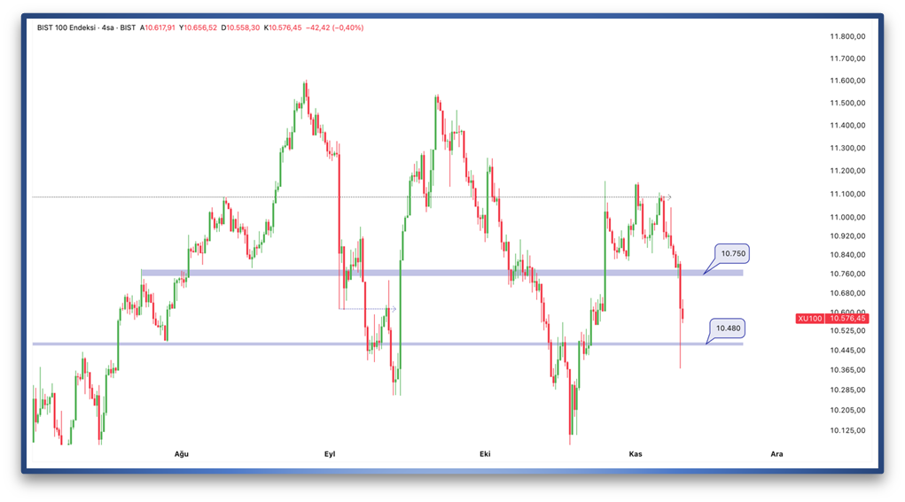 - BIST 100 endeksi dünkü işlemleri %1,97 oranında düşüşle 10.576 puandan tamamladı. Güne alıcılı bir başlangıç yapan endeks 10.810 seviyesinden açılırken, gün boyu 10.373 – 10.839 aralığında dalgalandı. Günün ilk yarısında 10.750 seviyesinin üzerinde dalgalanmalar devam etse de, ikinci yarıda satışların belirgin şekilde arttığı ve endeksin 23 Ekim’den bu yana en düşük seviyeden kapanış gerçekleştirdiği görüldü. Günlük işlem hacmi ise 174,5 milyar TL seviyesinde gerçekleşti.