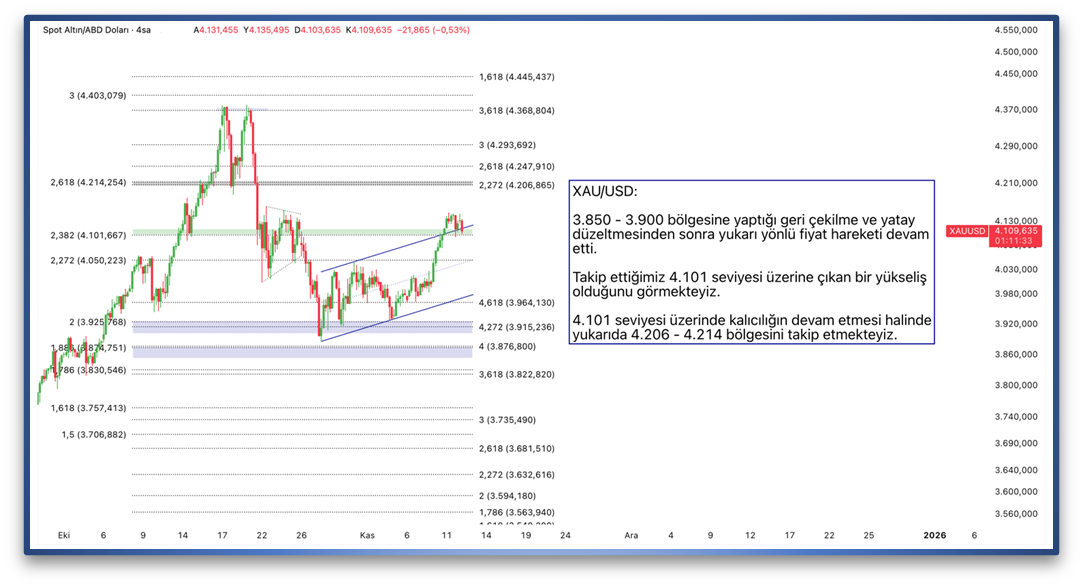 3.850 - 3.900 bölgesine yaptığı geri çekilme ve yatay düzeltmesinden sonra yukarı yönlü fiyat hareketi devam etti. Takip ettiğimiz 4.101 seviyesi üzerine çıkan bir yükseliş olduğunu görmekteyiz. 4.101 seviyesi üzerinde kalıcılığın devam etmesi halinde yukarıda 4.206 - 4.214 bölgesini takip etmekteyiz.
