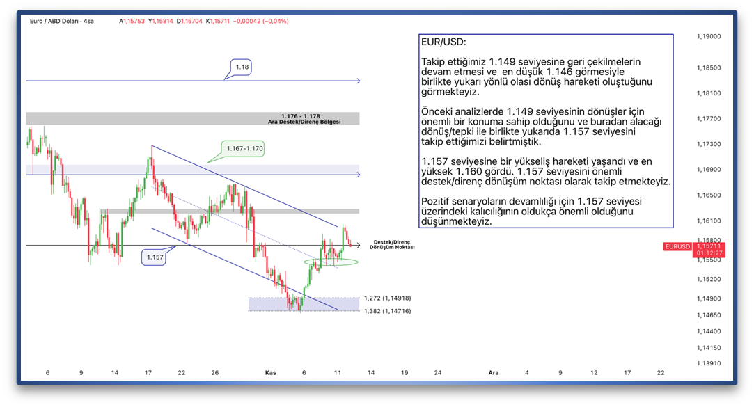 Takip ettiğimiz 1.149 seviyesine geri çekilmelerin devam etmesi ve en düşük 1.146 görmesiyle birlikte yukarı yönlü olası dönüş hareketi oluştuğunu görmekteyiz. Önceki analizlerde 1.149 seviyesinin dönüşler için önemli bir konuma sahip olduğunu ve buradan alacağı dönüş/tepki ile birlikte yukarıda 1.157 seviyesini takip ettiğimizi belirtmiştik. 1.157 seviyesine bir yükseliş hareketi yaşandı ve en yüksek 1.160 gördü. 1.157 seviyesini önemli destek/direnç dönüşüm noktası olarak takip etmekteyiz. Pozitif senaryoların devamlılığı için 1.157 seviyesi üzerindeki kalıcılığının oldukça önemli olduğunu düşünmekteyiz.
