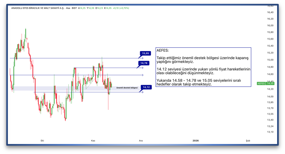 Takip ettiğimiz önemli destek bölgesi üzerinde kapanış yaptığını görmekteyiz. 14.12 seviyesi üzerinde yukarı yönlü fiyat hareketlerinin olası olabileceğini düşünmekteyiz. Yukarıda 14.58 - 14.78 ve 15.05 seviyelerini sıralı hedefler olarak takip etmekteyiz.