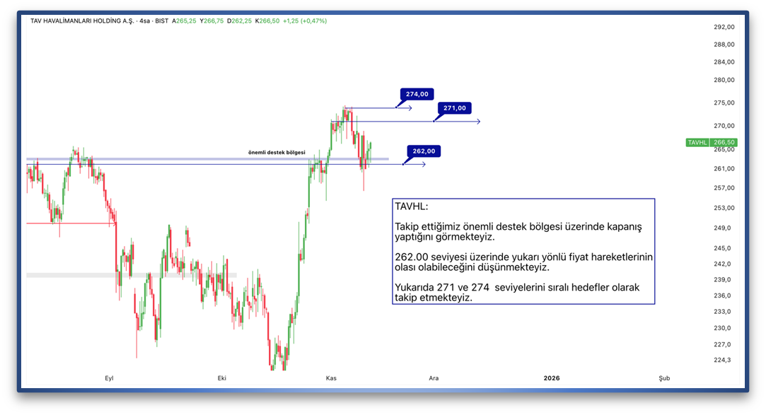 Takip ettiğimiz önemli destek bölgesi üzerinde kapanış yaptığını görmekteyiz. 262.00 seviyesi üzerinde yukarı yönlü fiyat hareketlerinin olası olabileceğini düşünmekteyiz. Yukarıda 271 ve 274 seviyelerini sıralı hedefler olarak takip etmekteyiz.