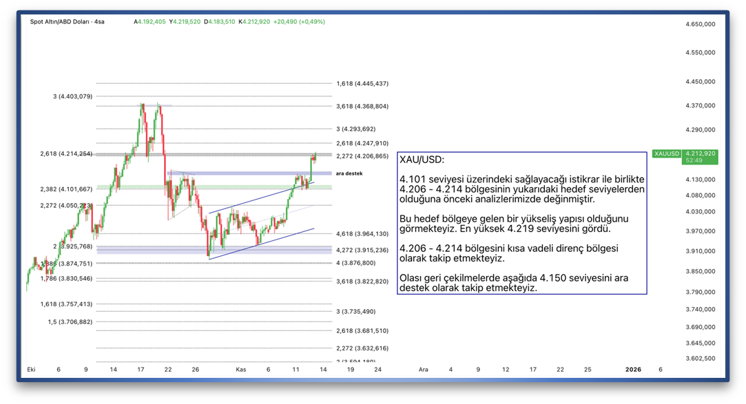 4.101 seviyesi üzerindeki sağlayacağı istikrar ile birlikte 4.206 - 4.214 bölgesinin yukarıdaki hedef seviyelerden olduğuna önceki analizlerimizde değinmiştir. Bu hedef bölgeye gelen bir yükseliş yapısı olduğunu görmekteyiz. En yüksek 4.219 seviyesini gördü. 4.206 - 4.214 bölgesini kısa vadeli direnç bölgesi olarak takip etmekteyiz. Olası geri çekilmelerde aşağıda 4.150 seviyesini ara destek olarak takip etmekteyiz.