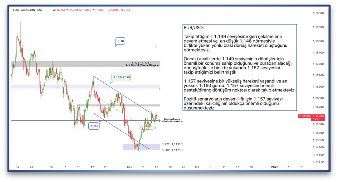 Takip ettiğimiz 1.149 seviyesine geri çekilmelerin devam etmesi ve en düşük 1.146 görmesiyle birlikte yukarı yönlü olası dönüş hareketi oluştuğunu görmekteyiz. Önceki analizlerde 1.149 seviyesinin dönüşler için önemli bir konuma sahip olduğunu ve buradan alacağı dönüş/tepki ile birlikte yukarıda 1.157 seviyesini takip ettiğimizi belirtmiştik. 1.157 seviyesine bir yükseliş hareketi yaşandı ve en yüksek 1.160 gördü. 1.157 seviyesini önemli destek/direnç dönüşüm noktası olarak takip etmekteyiz. Pozitif senaryoların devamlılığı için 1.157 seviyesi üzerindeki kalıcılığının oldukça önemli olduğunu düşünmekteyiz.
