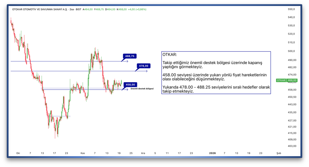 Takip ettiğimiz önemli destek bölgesi üzerinde kapanış yaptığını görmekteyiz. 458.00 seviyesi üzerinde yukarı yönlü fiyat hareketlerinin olası olabileceğini düşünmekteyiz. Yukarıda 478.00 - 488.25 seviyelerini sıralı hedefler olarak takip etmekteyiz.