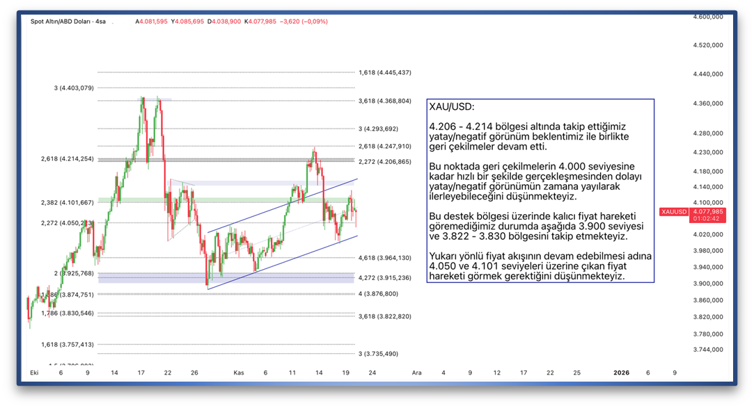 4.206 - 4.214 bölgesi altında takip ettiğimiz yatay/negatif görünüm beklentimiz ile birlikte geri çekilmeler devam etti. Bu noktada geri çekilmelerin 4.000 seviyesine kadar hızlı bir şekilde gerçekleşmesinden dolayı yatay/negatif görünümün zamana yayılarak ilerleyebileceğini düşünmekteyiz. Bu destek bölgesi üzerinde kalıcı fiyat hareketi göremediğimiz durumda aşağıda 3.900 seviyesi ve 3.822 - 3.830 bölgesini takip etmekteyiz. Yukarı yönlü fiyat akışının devam edebilmesi adına 4.050 ve 4.101 seviyeleri üzerine çıkan fiyat hareketi görmek gerektiğini düşünmekteyiz.