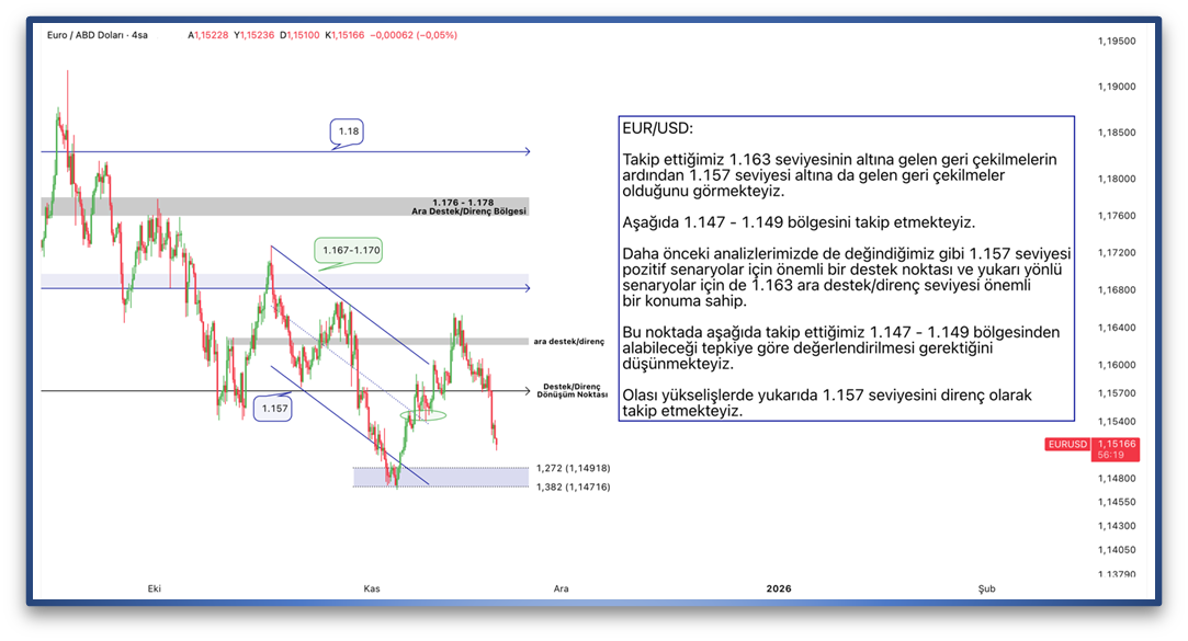 Takip ettiğimiz 1.163 seviyesinin altına gelen geri çekilmelerin ardından 1.157 seviyesi altına da gelen geri çekilmeler olduğunu görmekteyiz. Aşağıda 1.147 - 1.149 bölgesini takip etmekteyiz. Daha önceki analizlerimizde de değindiğimiz gibi 1.157 seviyesi pozitif senaryolar için önemli bir destek noktası ve yukarı yönlü senaryolar için de 1.163 ara destek/direnç seviyesi önemli bir konuma sahip. Bu noktada aşağıda takip ettiğimiz 1.147 - 1.149 bölgesinden alabileceği tepkiye göre değerlendirilmesi gerektiğini düşünmekteyiz. Olası yükselişlerde yukarıda 1.157 seviyesini direnç olarak takip etmekteyiz.