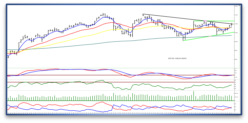- Endeksi teknik açıdan değerlendirdiğimizde, yukarı yönlü hareketlerde eylül ayından başlayan alçalan trendin direnç seviyesi olan 11.000 puanı takip ediyoruz. Dünkü işlemlerde bu bölge test edilse de üzerinde kapanış gerçekleşmedi. Endekste 11.000 seviyesinin üzerinde kalıcılık sağlanması durumunda yukarı yönlü hareketlerin devam edebileceğini tahmin etmekteyiz. Bu senaryoda 11.150 ara direnç olmak üzere 11.290 seviyesi hedef konumuna gelebilir.