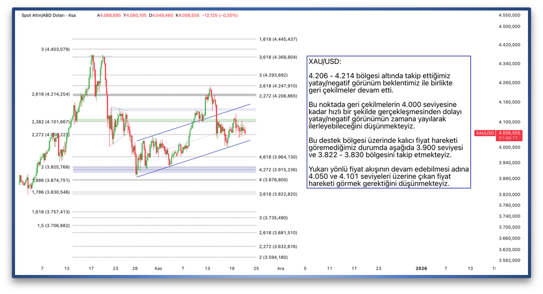 4.206 - 4.214 bölgesi altında takip ettiğimiz yatay/negatif görünüm beklentimiz ile birlikte geri çekilmeler devam etti. Bu noktada geri çekilmelerin 4.000 seviyesine kadar hızlı bir şekilde gerçekleşmesinden dolayı yatay/negatif görünümün zamana yayılarak ilerleyebileceğini düşünmekteyiz. Bu destek bölgesi üzerinde kalıcı fiyat hareketi göremediğimiz durumda aşağıda 3.900 seviyesi ve 3.822 - 3.830 bölgesini takip etmekteyiz. Yukarı yönlü fiyat akışının devam edebilmesi adına 4.050 ve 4.101 seviyeleri üzerine çıkan fiyat hareketi görmek gerektiğini düşünmekteyiz.