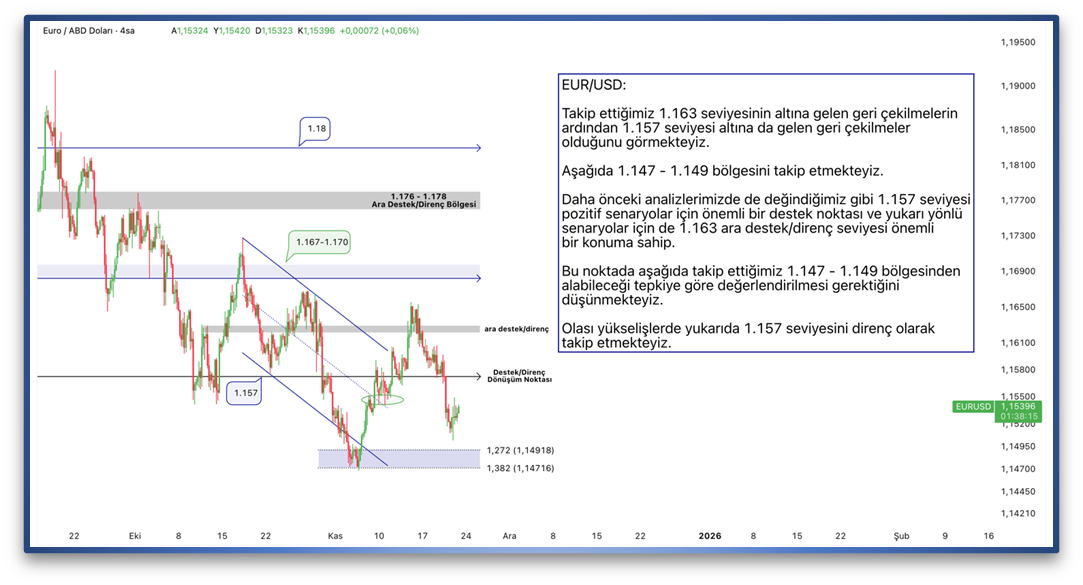 Takip ettiğimiz 1.163 seviyesinin altına gelen geri çekilmelerin ardından 1.157 seviyesi altına da gelen geri çekilmeler olduğunu görmekteyiz. Aşağıda 1.147 - 1.149 bölgesini takip etmekteyiz. Daha önceki analizlerimizde de değindiğimiz gibi 1.157 seviyesi pozitif senaryolar için önemli bir destek noktası ve yukarı yönlü senaryolar için de 1.163 ara destek/direnç seviyesi önemli bir konuma sahip. Bu noktada aşağıda takip ettiğimiz 1.147 - 1.149 bölgesinden alabileceği tepkiye göre değerlendirilmesi gerektiğini düşünmekteyiz. Olası yükselişlerde yukarıda 1.157 seviyesini direnç olarak takip etmekteyiz.