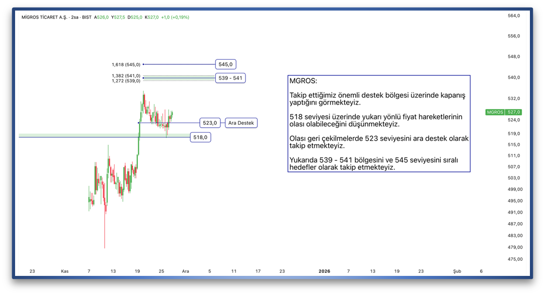 Takip ettiğimiz önemli destek bölgesi üzerinde kapanış yaptığını görmekteyiz. 518 seviyesi üzerinde yukarı yönlü fiyat hareketlerinin olası olabileceğini düşünmekteyiz. Olası geri çekilmelerde 523 seviyesini ara destek olarak takip etmekteyiz. Yukarıda 539 - 541 bölgesini ve 545 seviyesini sıralı hedefler olarak takip etmekteyiz.