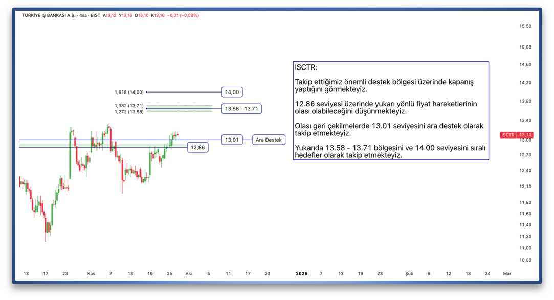 Takip ettiğimiz önemli destek bölgesi üzerinde kapanış yaptığını görmekteyiz. 12.86 seviyesi üzerinde yukarı yönlü fiyat hareketlerinin olası olabileceğini düşünmekteyiz. Olası geri çekilmelerde 13.01 seviyesini ara destek olarak takip etmekteyiz. Yukarıda 13.58 - 13.71 bölgesini ve 14.00 seviyesini sıralı hedefler olarak takip etmekteyiz.