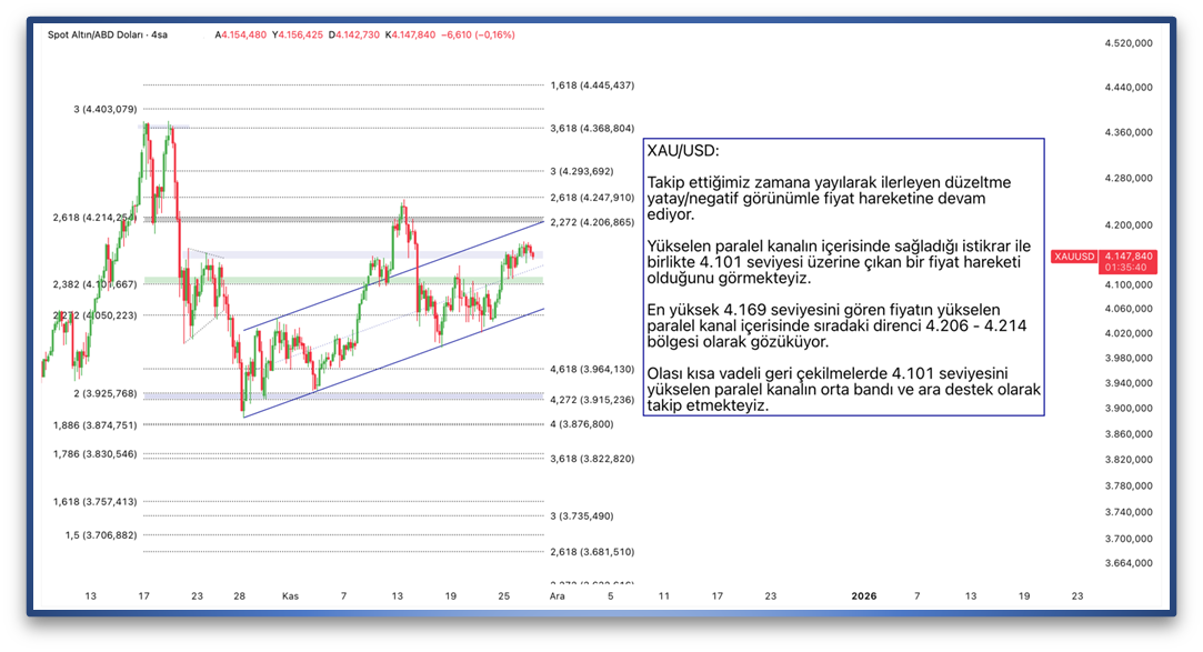Takip ettiğimiz zamana yayılarak ilerleyen düzeltme yatay/negatif görünümle fiyat hareketine devam ediyor. Yükselen paralel kanalın içerisinde sağladığı istikrar ile birlikte 4.101 seviyesi üzerine çıkan bir fiyat hareketi olduğunu görmekteyiz. En yüksek 4.169 seviyesini gören fiyatın yükselen paralel kanal içerisinde sıradaki direnci 4.206 - 4.214 bölgesi olarak gözüküyor. Olası kısa vadeli geri çekilmelerde 4.101 seviyesini yükselen paralel kanalın orta bandı ve ara destek olarak takip etmekteyiz.