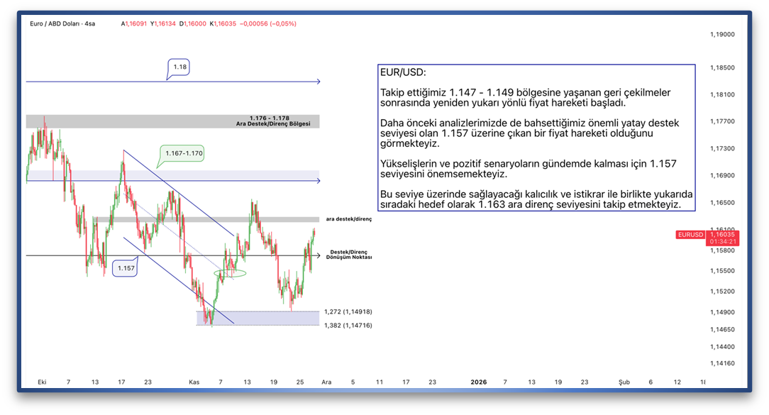 Takip ettiğimiz 1.147 - 1.149 bölgesine yaşanan geri çekilmeler sonrasında yeniden yukarı yönlü fiyat hareketi başladı. Daha önceki analizlerimizde de bahsettiğimiz önemli yatay destek seviyesi olan 1.157 üzerine çıkan bir fiyat hareketi olduğunu görmekteyiz. Yükselişlerin ve pozitif senaryoların gündemde kalması için 1.157 seviyesini önemsemekteyiz. Bu seviye üzerinde sağlayacağı kalıcılık ve istikrar ile birlikte yukarıda sıradaki hedef olarak 1.163 ara direnç seviyesini takip etmekteyiz.
