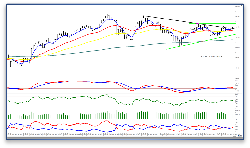 - Teknik tarafta, kısa vadeli görünümde izlediğimiz alçalan direnç seviyesinin üzerine çıkılmasına karşın bu hareketin güçlü ve hacimli bir kapanışla desteklenmediğini görüyoruz. Bu nedenle 11.000 puan seviyesini kısa vadeli ana direnç olarak takip etmeyi sürdürüyoruz. Bu seviyenin hacim destekli kırılması durumunda yukarı yönlü hareketin ivmelenmesi ve ilk etapta 11.150 puan bölgesine doğru yükseliş potansiyeli gündeme gelebilir.