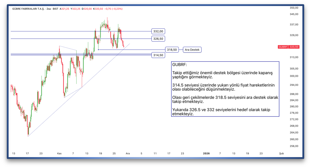 Takip ettiğimiz önemli destek bölgesi üzerinde kapanış yaptığını görmekteyiz. 314.5 seviyesi üzerinde yukarı yönlü fiyat hareketlerinin olası olabileceğini düşünmekteyiz. Olası geri çekilmelerde 318.5 seviyesini ara destek olarak takip etmekteyiz. Yukarıda 326.5 ve 332 seviyelerini hedef olarak takip etmekteyiz