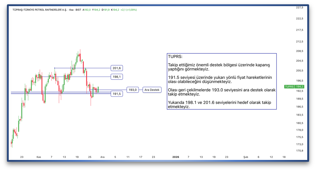 Takip ettiğimiz önemli destek bölgesi üzerinde kapanış yaptığını görmekteyiz. 191.5 seviyesi üzerinde yukarı yönlü fiyat hareketlerinin olası olabileceğini düşünmekteyiz. Olası geri çekilmelerde 193.0 seviyesini ara destek olarak takip etmekteyiz. Yukarıda 198.1 ve 201.6 seviyelerini hedef olarak takip etmekteyiz.