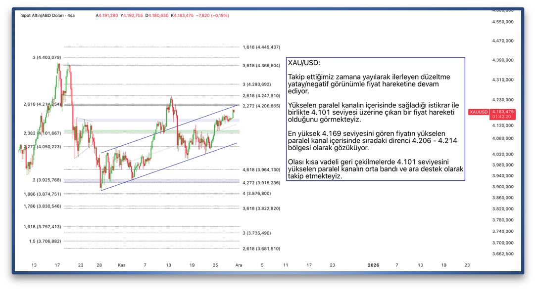Takip ettiğimiz zamana yayılarak ilerleyen düzeltme yatay/negatif görünümle fiyat hareketine devam ediyor. Yükselen paralel kanalın içerisinde sağladığı istikrar ile birlikte 4.101 seviyesi üzerine çıkan bir fiyat hareketi olduğunu görmekteyiz. En yüksek 4.169 seviyesini gören fiyatın yükselen paralel kanal içerisinde sıradaki direnci 4.206 - 4.214 bölgesi olarak gözüküyor. Olası kısa vadeli geri çekilmelerde 4.101 seviyesini yükselen paralel kanalın orta bandı ve ara destek olarak takip etmekteyiz.