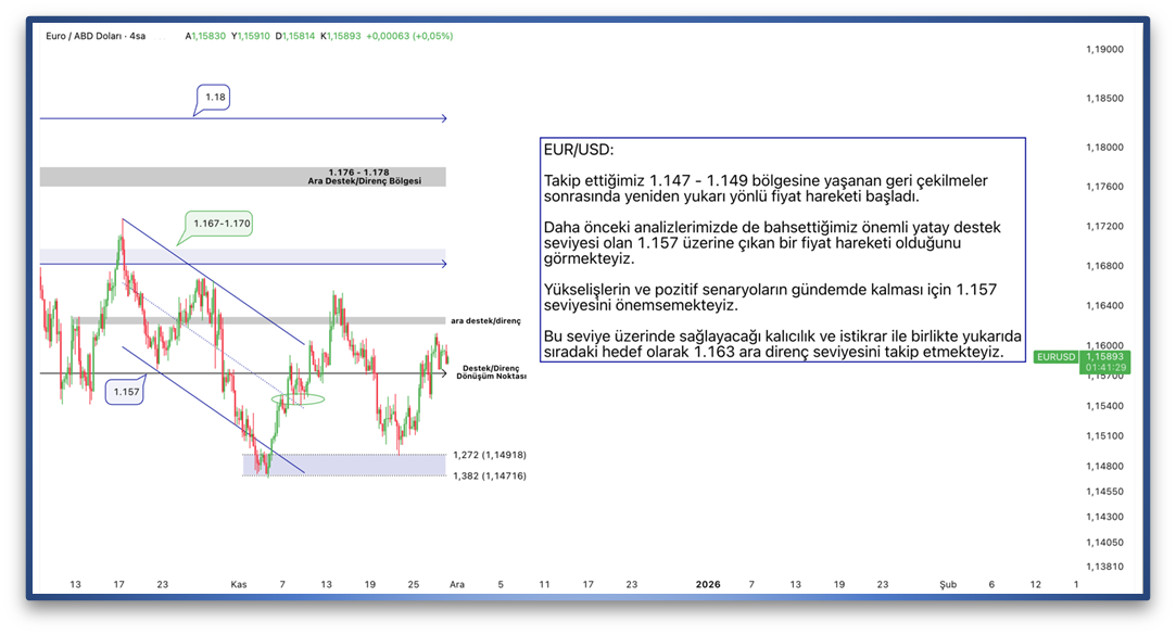 Takip ettiğimiz 1.147 - 1.149 bölgesine yaşanan geri çekilmeler sonrasında yeniden yukarı yönlü fiyat hareketi başladı. Daha önceki analizlerimizde de bahsettiğimiz önemli yatay destek seviyesi olan 1.157 üzerine çıkan bir fiyat hareketi olduğunu görmekteyiz. Yükselişlerin ve pozitif senaryoların gündemde kalması için 1.157 seviyesini önemsemekteyiz. Bu seviye üzerinde sağlayacağı kalıcılık ve istikrar ile birlikte yukarıda sıradaki hedef olarak 1.163 ara direnç seviyesini takip etmekteyiz.
