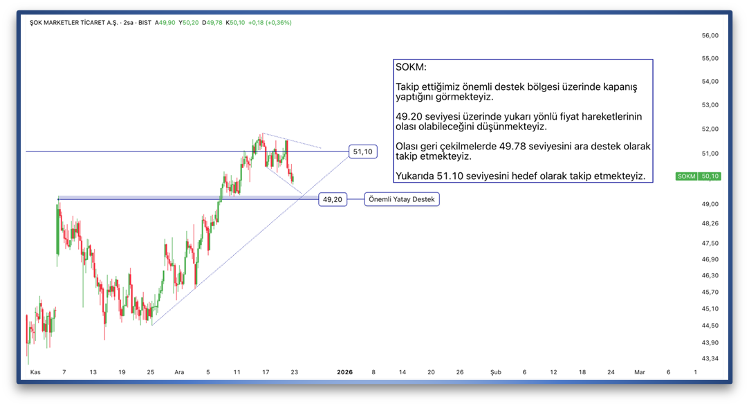 Takip ettiğimiz önemli destek bölgesi üzerinde kapanış yaptığını görmekteyiz. 49.20 seviyesi üzerinde yukarı yönlü fiyat hareketlerinin olası olabileceğini düşünmekteyiz. Olası geri çekilmelerde 49.78 seviyesini ara destek olarak takip etmekteyiz. Yukarıda 51.10 seviyesini hedef olarak takip etmekteyiz.
