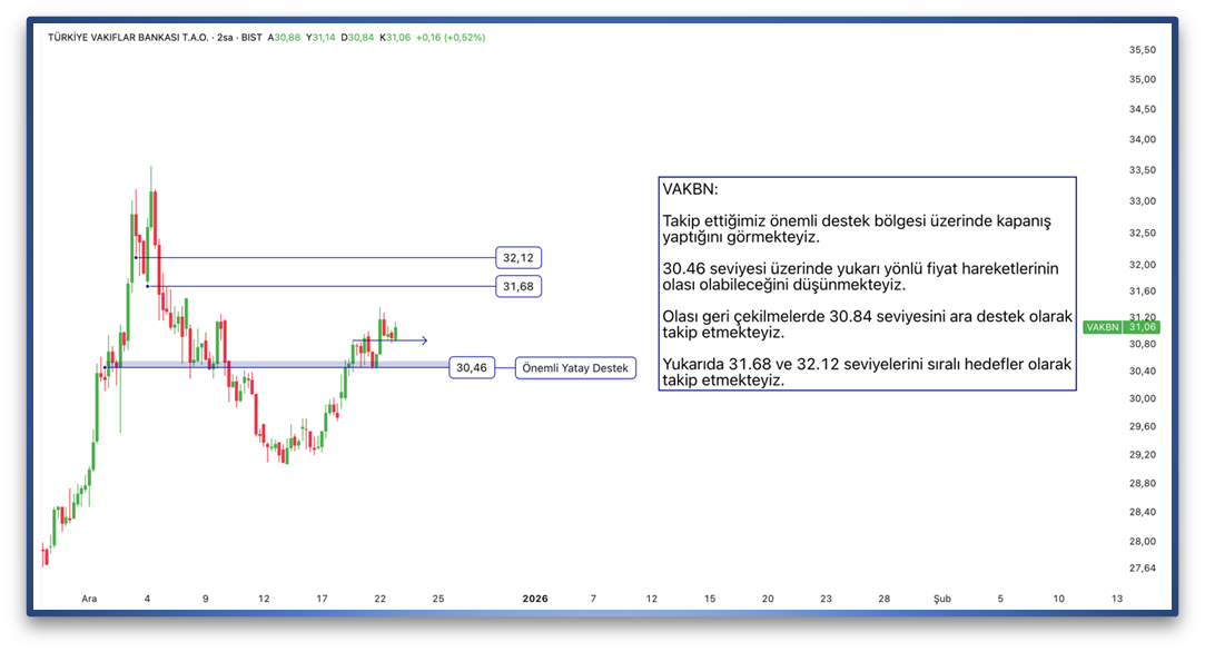 Takip ettiğimiz önemli destek bölgesi üzerinde kapanış yaptığını görmekteyiz. 30.46 seviyesi üzerinde yukarı yönlü fiyat hareketlerinin olası olabileceğini düşünmekteyiz. Olası geri çekilmelerde 30.84 seviyesini ara destek olarak takip etmekteyiz. Yukarıda 31.68 ve 32.12 seviyelerini sıralı hedefler olarak takip etmekteyiz.