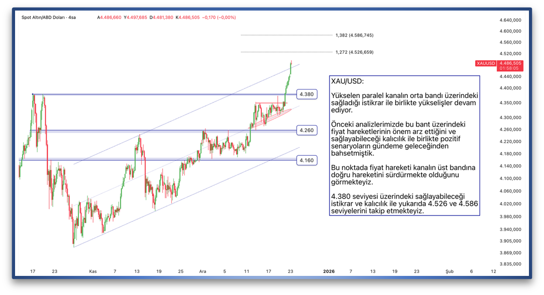 Yükselen paralel kanalın orta bandı üzerindeki sağladığı istikrar ile birlikte yükselişler devam ediyor. Önceki analizlerimizde bu bant üzerindeki fiyat hareketlerinin önem arz ettiğini ve sağlayabileceği kalıcılık ile birlikte pozitif senaryoların gündeme geleceğinden bahsetmiştik. Bu noktada fiyat hareketi kanalın üst bandına doğru hareketini sürdürmekte olduğunu görmekteyiz. 4.380 seviyesi üzerindeki sağlayabileceği istikrar ve kalıcılık ile yukarıda 4.526 ve 4.586 seviyelerini takip etmekteyiz.