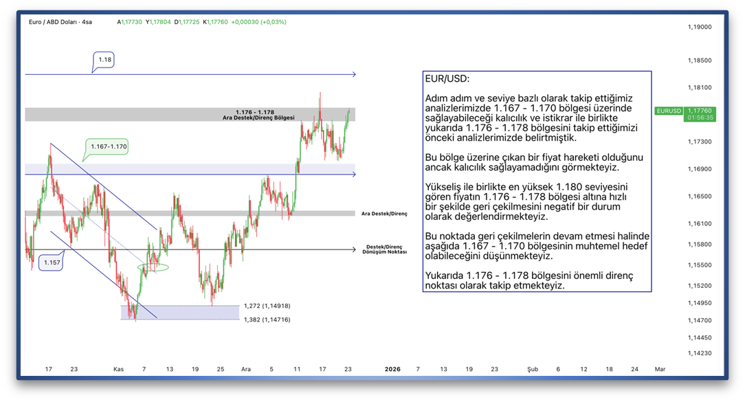 Adım adım ve seviye bazlı olarak takip ettiğimiz analizlerimizde 1.167 - 1.170 bölgesi üzerinde sağlayabileceği kalıcılık ve istikrar ile birlikte yukarıda 1.176 - 1.178 bölgesini takip ettiğimizi önceki analizlerimizde belirtmiştik. Bu bölge üzerine çıkan bir fiyat hareketi olduğunu ancak kalıcılık sağlayamadığını görmekteyiz. Yükseliş ile birlikte en yüksek 1.180 seviyesini gören fiyatın 1.176 - 1.178 bölgesi altına hızlı bir şekilde geri çekilmesini negatif bir durum olarak değerlendirmekteyiz. Bu noktada geri çekilmelerin devam etmesi halinde aşağıda 1.167 - 1.170 bölgesinin muhtemel hedef olabileceğini düşünmekteyiz. Yukarıda 1.176 - 1.178 bölgesini önemli direnç noktası olarak takip etmekteyiz.