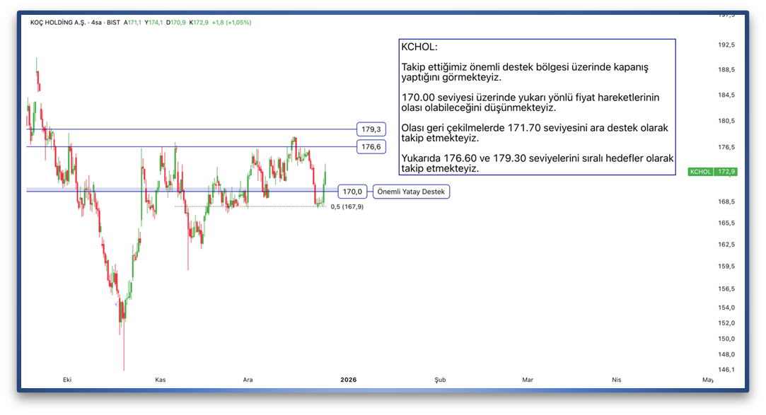 Takip ettiğimiz önemli destek bölgesi üzerinde kapanış yaptığını görmekteyiz. 170.00 seviyesi üzerinde yukarı yönlü fiyat hareketlerinin olası olabileceğini düşünmekteyiz. Olası geri çekilmelerde 171.70 seviyesini ara destek olarak takip etmekteyiz. Yukarıda 176.60 ve 179.30 seviyelerini sıralı hedefler olarak takip etmekteyiz.