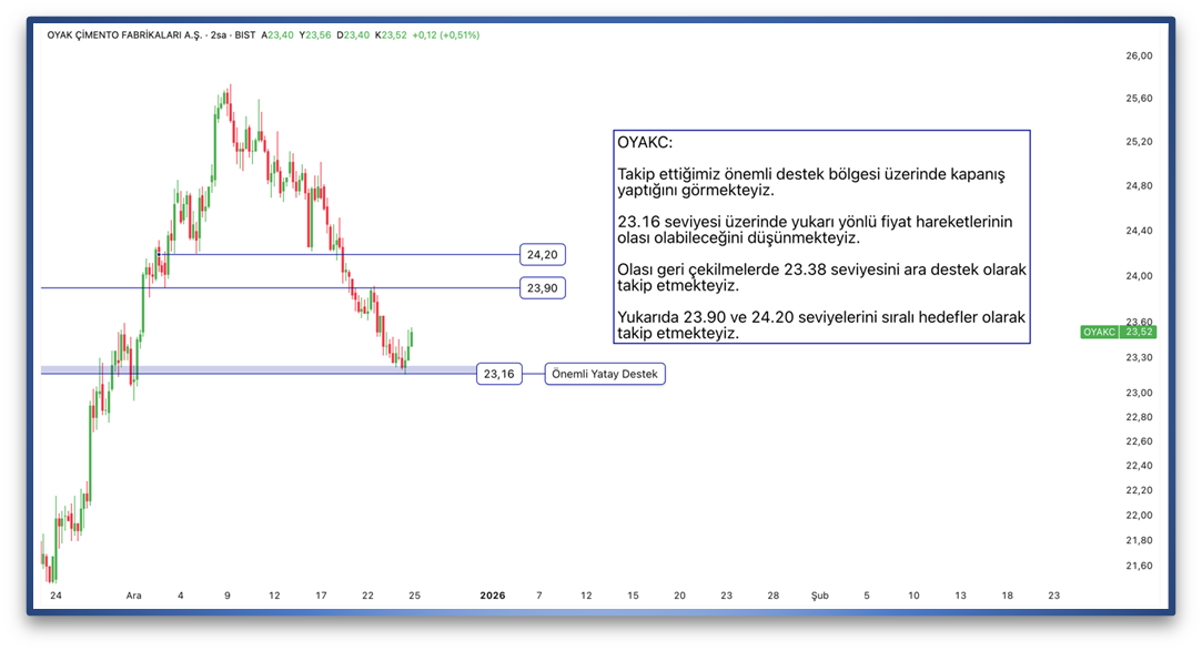 Takip ettiğimiz önemli destek bölgesi üzerinde kapanış yaptığını görmekteyiz. 23.16 seviyesi üzerinde yukarı yönlü fiyat hareketlerinin olası olabileceğini düşünmekteyiz. Olası geri çekilmelerde 23.38 seviyesini ara destek olarak takip etmekteyiz. Yukarıda 23.90 ve 24.20 seviyelerini sıralı hedefler olarak takip etmekteyiz.