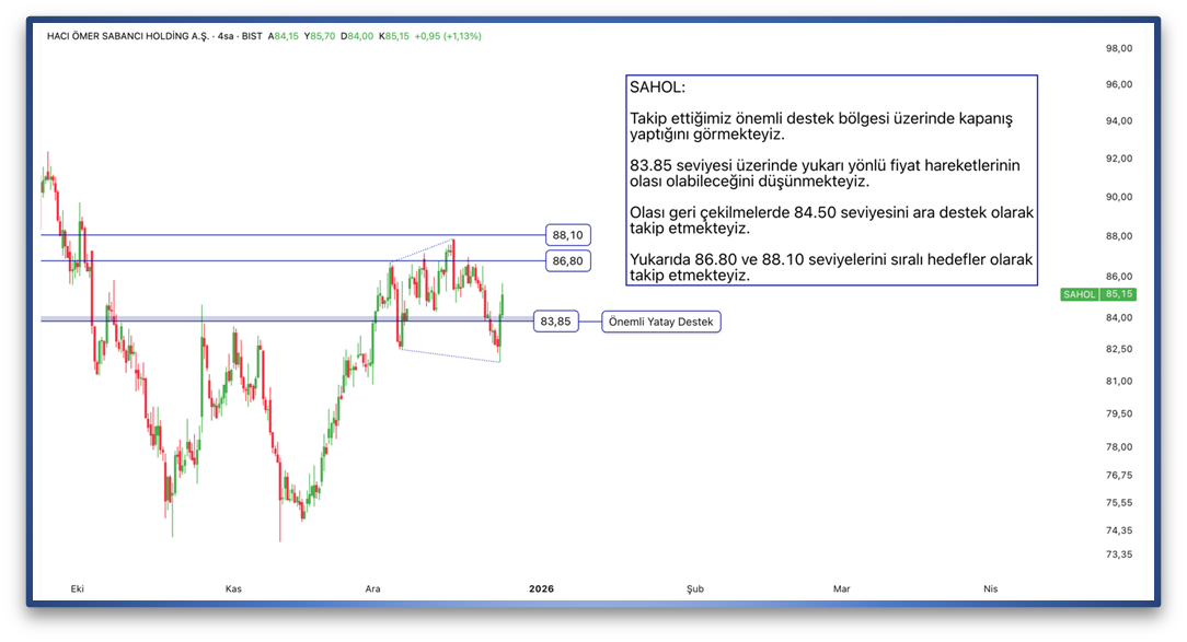 Takip ettiğimiz önemli destek bölgesi üzerinde kapanış yaptığını görmekteyiz. 83.85 seviyesi üzerinde yukarı yönlü fiyat hareketlerinin olası olabileceğini düşünmekteyiz. Olası geri çekilmelerde 84.50 seviyesini ara destek olarak takip etmekteyiz. Yukarıda 86.80 ve 88.10 seviyelerini sıralı hedefler olarak takip etmekteyiz.