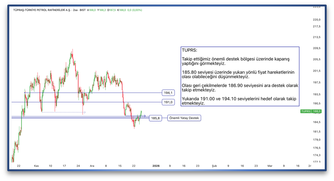 Takip ettiğimiz önemli destek bölgesi üzerinde kapanış yaptığını görmekteyiz. 185.80 seviyesi üzerinde yukarı yönlü fiyat hareketlerinin olası olabileceğini düşünmekteyiz. Olası geri çekilmelerde 186.90 seviyesini ara destek olarak takip etmekteyiz. Yukarıda 191.00 ve 194.10 seviyelerini hedef olarak takip etmekteyiz.