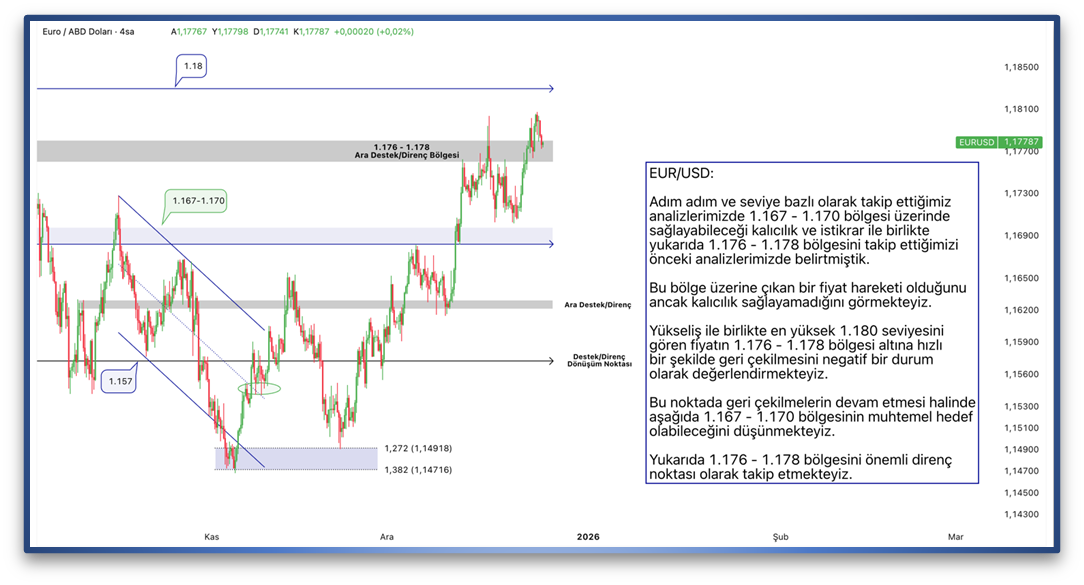 Adım adım ve seviye bazlı olarak takip ettiğimiz analizlerimizde 1.167 - 1.170 bölgesi üzerinde sağlayabileceği kalıcılık ve istikrar ile birlikte yukarıda 1.176 - 1.178 bölgesini takip ettiğimizi önceki analizlerimizde belirtmiştik. Bu bölge üzerine çıkan bir fiyat hareketi olduğunu ancak kalıcılık sağlayamadığını görmekteyiz. Yükseliş ile birlikte en yüksek 1.180 seviyesini gören fiyatın 1.176 - 1.178 bölgesi altına hızlı bir şekilde geri çekilmesini negatif bir durum olarak değerlendirmekteyiz. Bu noktada geri çekilmelerin devam etmesi halinde aşağıda 1.167 - 1.170 bölgesinin muhtemel hedef olabileceğini düşünmekteyiz. Yukarıda 1.176 - 1.178 bölgesini önemli direnç noktası olarak takip etmekteyiz.