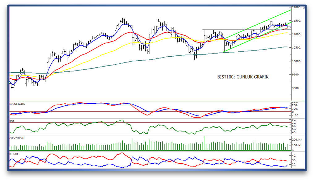 - Endekste güçlenme hareketinin başlayabilmesi için kısa vadeli trend açısından izlediğimiz 5 günlük üssel hareketli ortalama (11.315) üzerine çıkılması gerektiğini düşünüyoruz. Bu durum gerçekleşirse, kısa vadeli direnç olarak 11.360 seviyesi izlenebilir. Yukarı yönlü hareketin devamında ise 11.470 seviyesini bir sonraki önemli direnç konumunda takip edeceğiz.