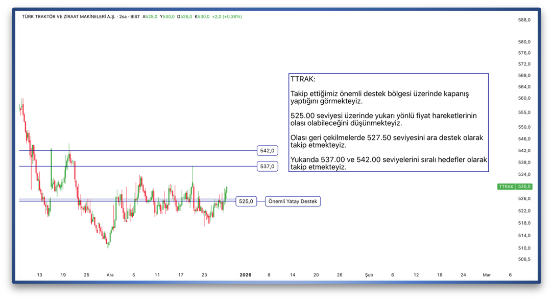 Takip ettiğimiz önemli destek bölgesi üzerinde kapanış yaptığını görmekteyiz. 525.00 seviyesi üzerinde yukarı yönlü fiyat hareketlerinin olası olabileceğini düşünmekteyiz. Olası geri çekilmelerde 527.50 seviyesini ara destek olarak takip etmekteyiz. Yukarıda 537.00 ve 542.00 seviyelerini sıralı hedefler olarak takip etmekteyiz.
