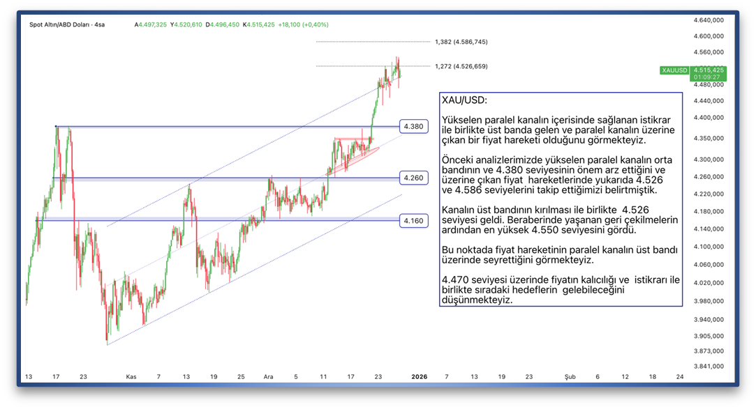 Yükselen paralel kanalın içerisinde sağlanan istikrar ile birlikte üst banda gelen ve paralel kanalın üzerine çıkan bir fiyat hareketi olduğunu görmekteyiz. Önceki analizlerimizde yükselen paralel kanalın orta bandının ve 4.380 seviyesinin önem arz ettiğini ve üzerine çıkan fiyat hareketlerinde yukarıda 4.526 ve 4.586 seviyelerini takip ettiğimizi belirtmiştik. Kanalın üst bandının kırılması ile birlikte 4.526 seviyesi geldi. Beraberinde yaşanan geri çekilmelerin ardından en yüksek 4.550 seviyesini gördü. Bu noktada fiyat hareketinin paralel kanalın üst bandı üzerinde seyrettiğini görmekteyiz. 4.470 seviyesi üzerinde fiyatın kalıcılığı ve istikrarı ile birlikte sıradaki hedeflerin gelebileceğini düşünmekteyiz.
