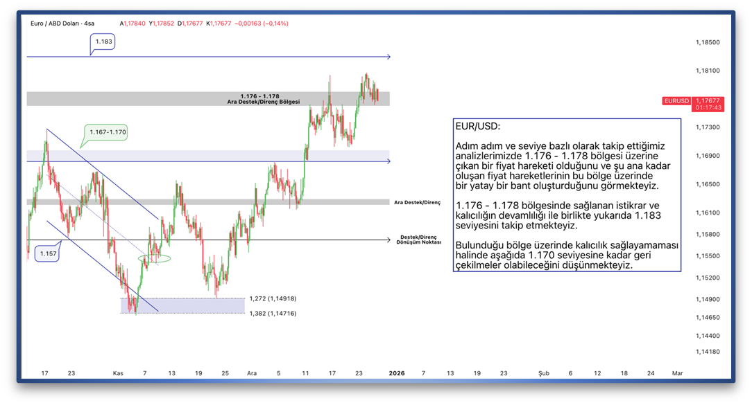 Adım adım ve seviye bazlı olarak takip ettiğimiz analizlerimizde 1.176 - 1.178 bölgesi üzerine çıkan bir fiyat hareketi olduğunu ve şu ana kadar oluşan fiyat hareketlerinin bu bölge üzerinde bir yatay bir bant oluşturduğunu görmekteyiz. 1.176 - 1.178 bölgesinde sağlanan istikrar ve kalıcılığın devamlılığı ile birlikte yukarıda 1.183 seviyesini takip etmekteyiz. Bulunduğu bölge üzerinde kalıcılık sağlayamaması halinde aşağıda 1.170 seviyesine kadar geri çekilmeler olabileceğini düşünmekteyiz.