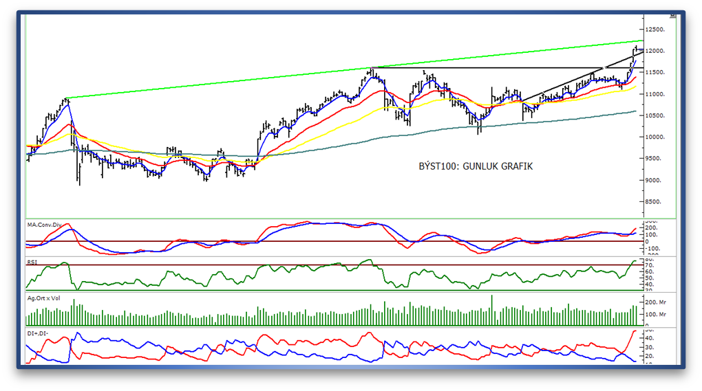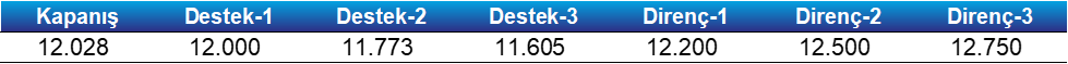 - Teknik açıdan, kısa vadede yükseliş ivmesinin devamı için 12.000 puan seviyesinin üzerinde kalıcılığın önemli olduğunu düşünüyoruz. Bu senaryoda ilk etapta yükselen trend direnç bölgesi konumunda takip ettiğimiz 12.200 seviyeleri hedeflenebilir.