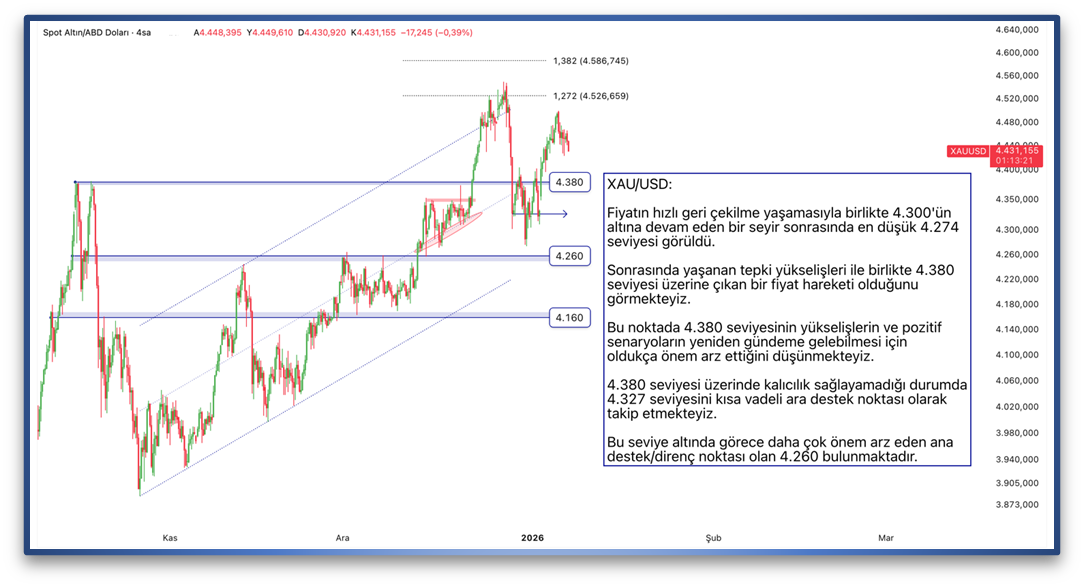Fiyatın hızlı geri çekilme yaşamasıyla birlikte 4.300'ün altına devam eden bir seyir sonrasında en düşük 4.274 seviyesi görüldü. Sonrasında yaşanan tepki yükselişleri ile birlikte 4.380 seviyesi üzerine çıkan bir fiyat hareketi olduğunu görmekteyiz. Bu noktada 4.380 seviyesinin yükselişlerin ve pozitif senaryoların yeniden gündeme gelebilmesi için oldukça önem arz ettiğini düşünmekteyiz. 4.380 seviyesi üzerinde kalıcılık sağlayamadığı durumda 4.327 seviyesini kısa vadeli ara destek noktası olarak takip etmekteyiz. Bu seviye altında görece daha çok önem arz eden ana destek/direnç noktası olan 4.260 bulunmaktadır.